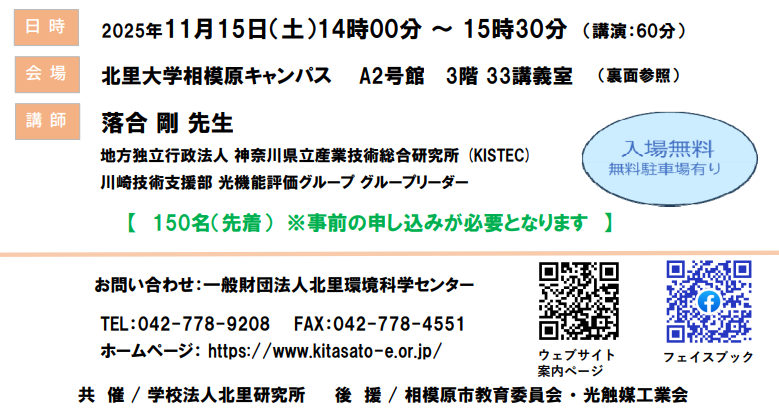 一般財団法人 北里環境科学センターが主催する、第42回環境科学セミナーが、北里大学相模原キャンパスで開催されます。今回は、「光触媒がつくる未来のくらし」と題して、(地独)神奈川県立産業技術総合研究所 落合先生をお招きし、ご講演を頂きます。また講演当日は、光触媒の浄化作用を体験できるブースも設置致します。ご参加お待ちしています!