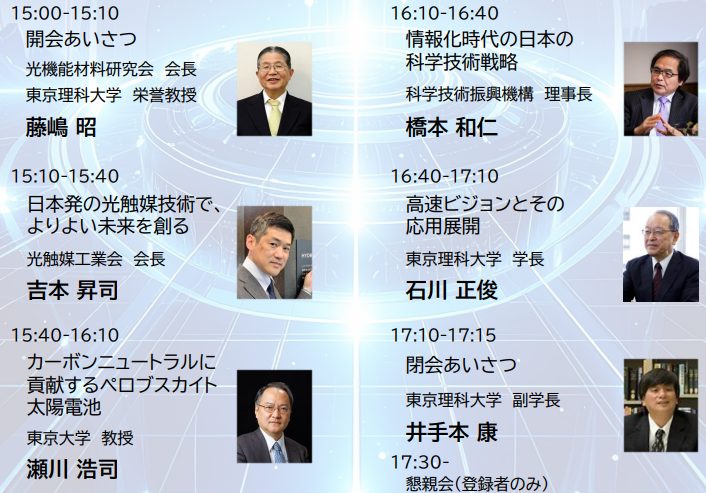 主催: 光機能材料研究会、東京理科大学総合研究院スペースシステム創造研究センター、東京理科大学総合研究院カーボンバリュー研究拠点、光触媒工業会